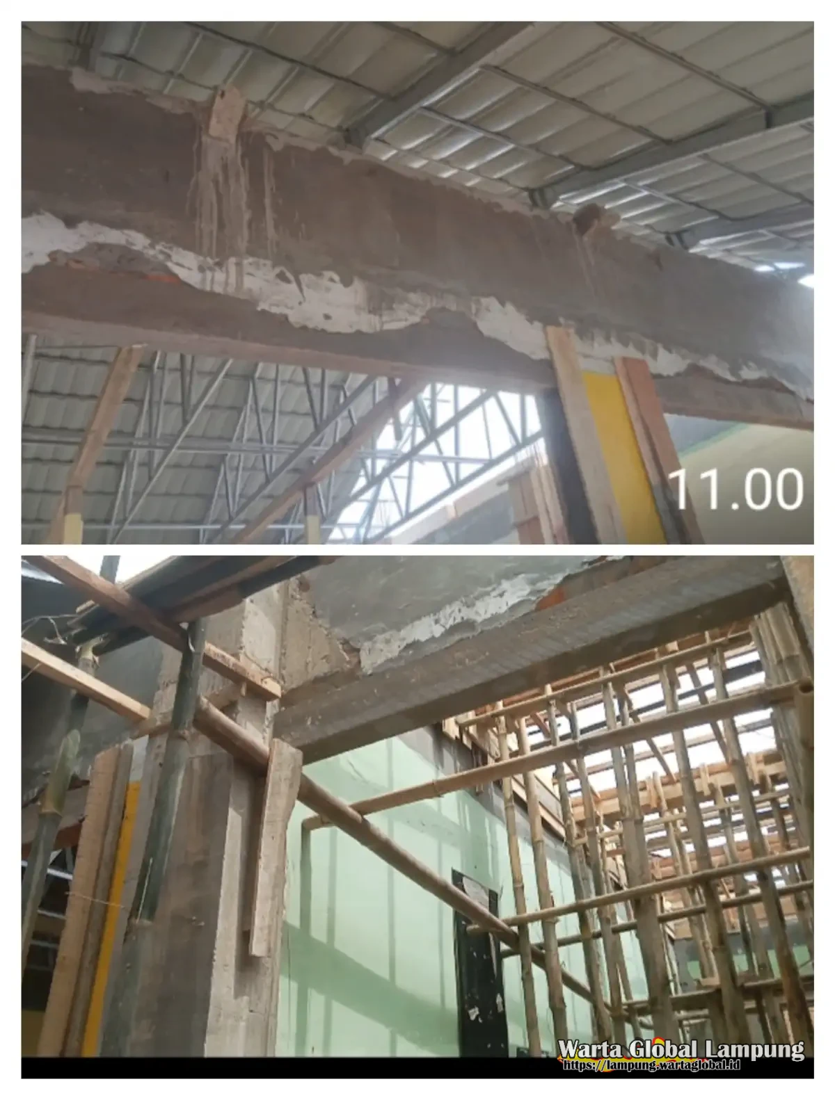 Terlihat Jelas Senin 3 Januari 2025 pada bangunan lama bagian pintu sudah mulai retak kecil dari atas sampai bawah seakan tak tak mampu menahan berat beban dari bangunan baru, lantai dua bagian atas, sehingga dinding lama bagian pintu saat ini mengalami keretakan.